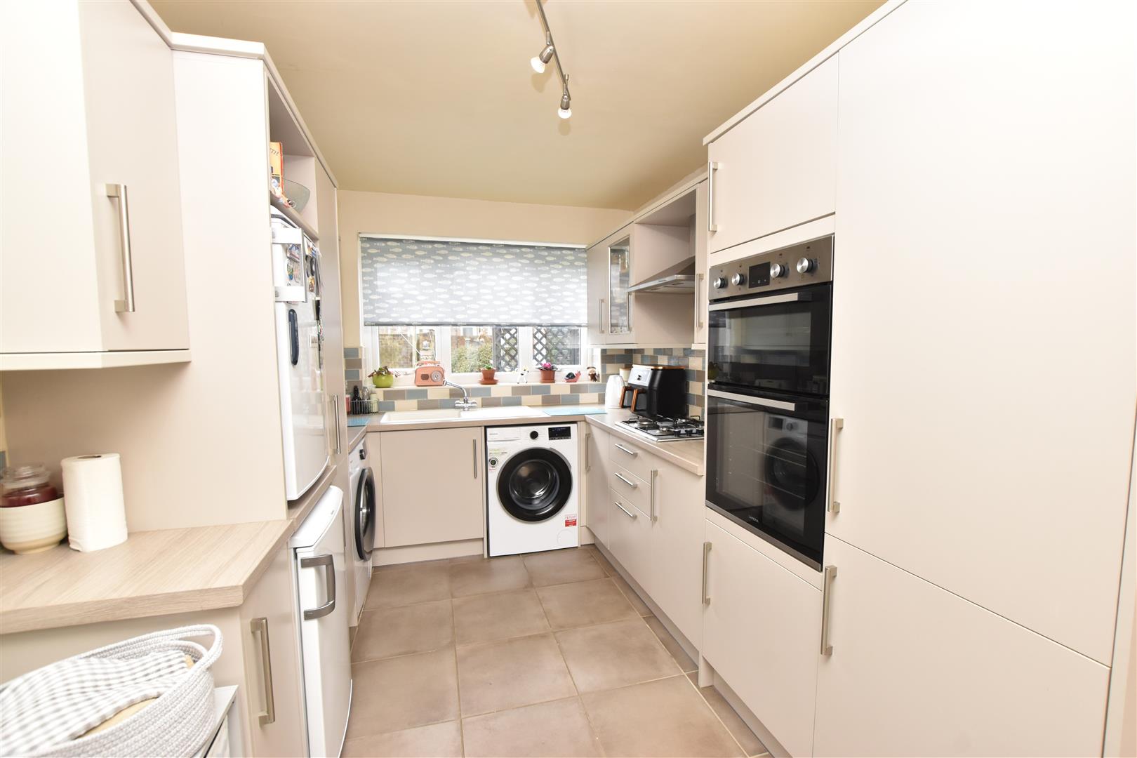 Fitted with a modern range of Kashmir finished base and wall cupboards incorporating a gas hob with an extractor chimney above together with an electric oven and grill. The modern gas fired boiler is concealed within a matching cupboard. The contrasting work surfaces are inset with a cream resin unit which has complementary coloured tiled splash backs. Tiled flooring. Double glazed window and door. Useful under stairs storage cupboard.