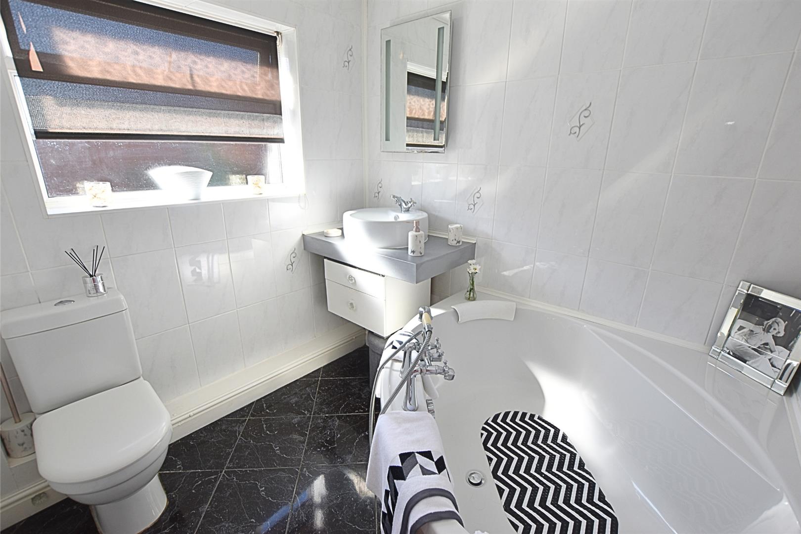 Fitted with a white suite comprising a corner bath having a hand held shower attachment, a vanity unit and a low flush wc. Double glazed window. Radiator. Complementary tiled walls.