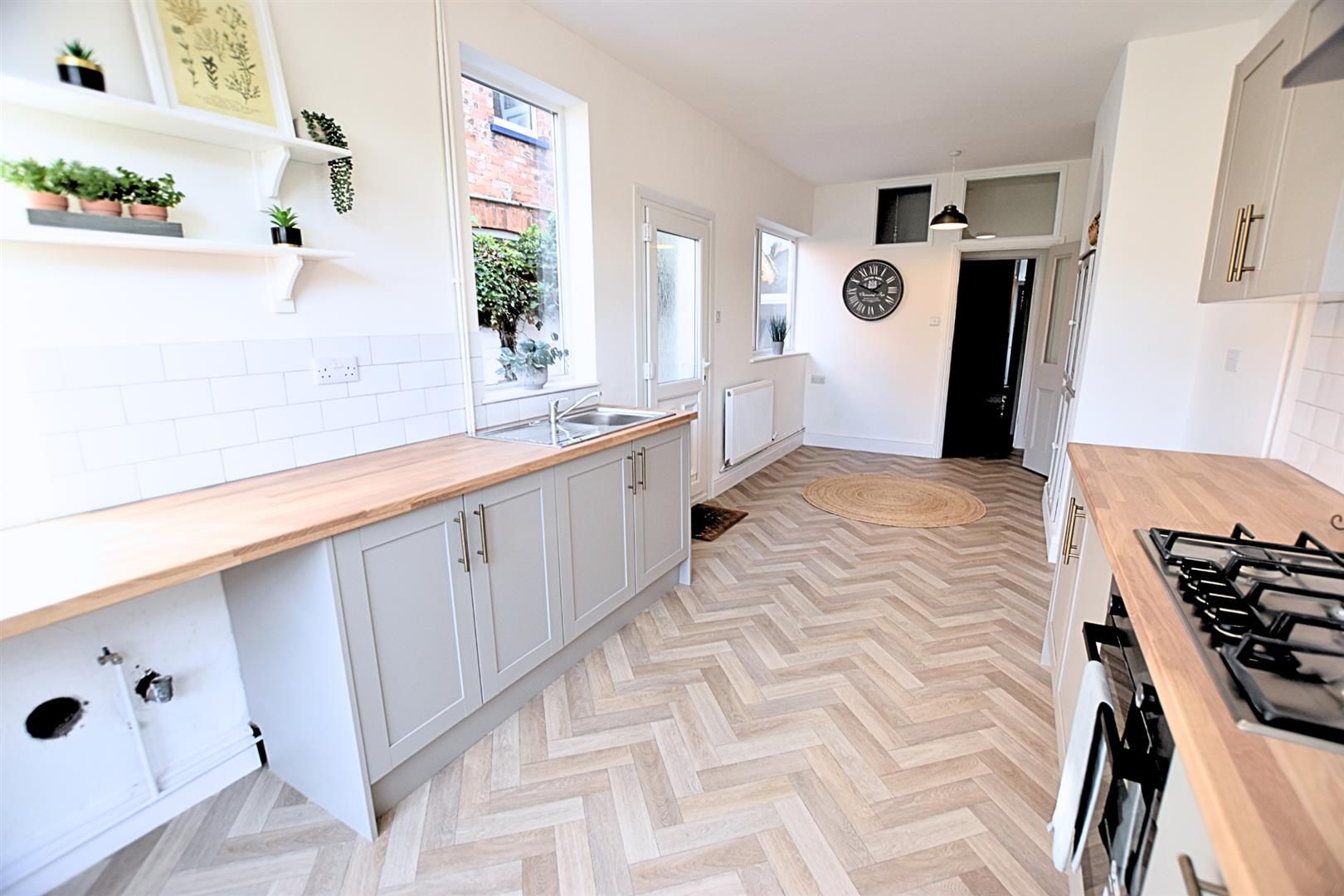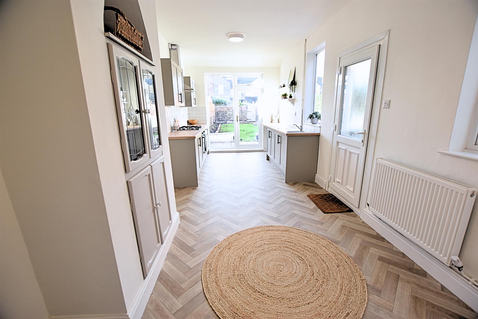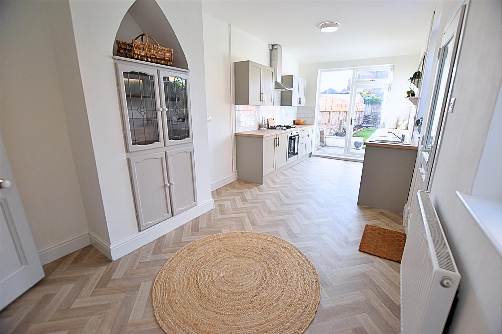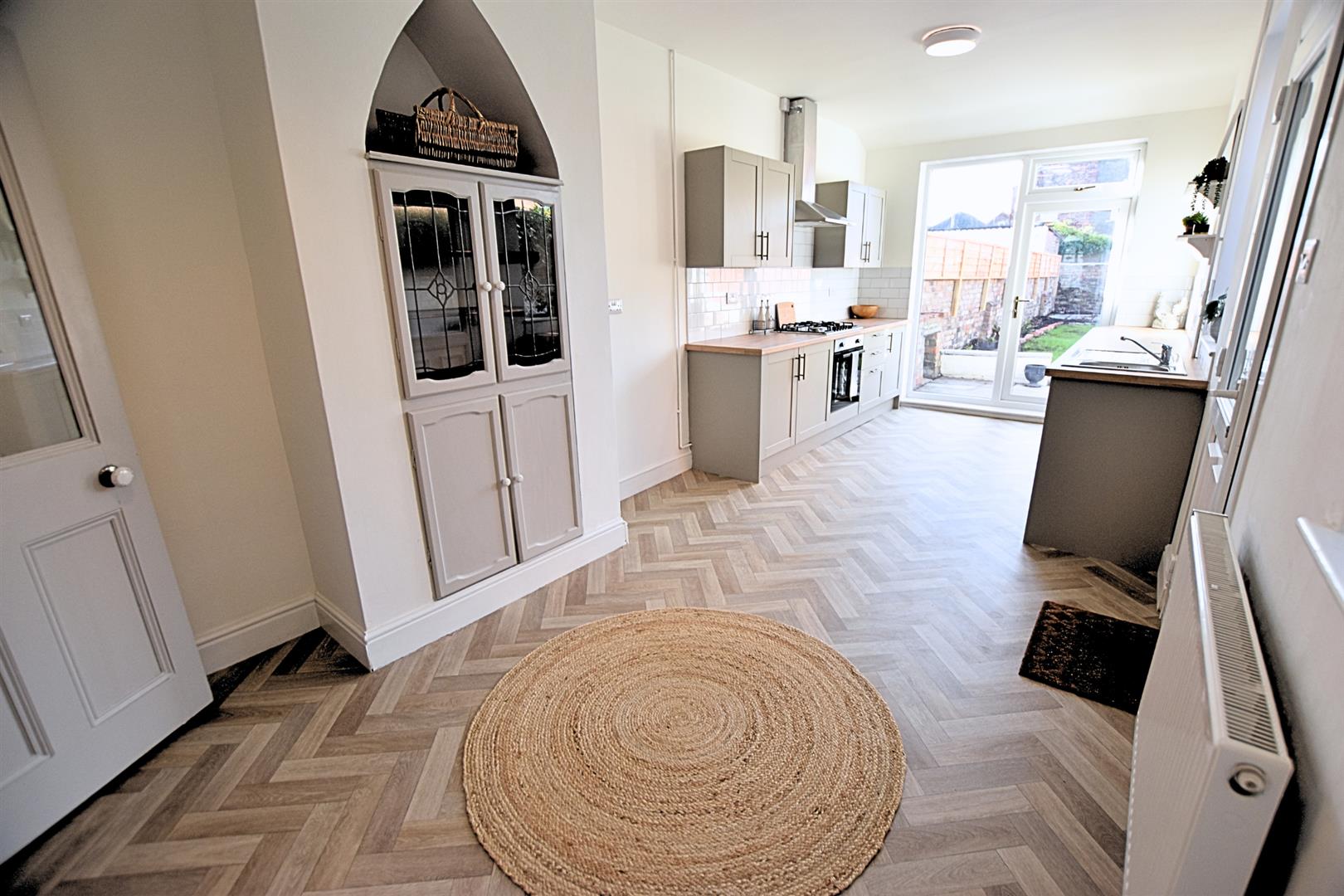 This stylish open-plan living kitchen diner is the heart of the home, offering a perfect blend of modern design and practical family living. The newly fitted contemporary kitchen features pebbled coloured sleek shaker-style units with matching pan draws, wood-effect worktops, tiled splashbacks and incorporates a stainless steel sink and drainer, gas hob, electric fan assisted oven and stainless steel chimney style extractor hood and ample space for a freestanding fridge freezer, under counter space for washing machine and tumble dryer. The herringbone style vinyl flooring flows seamlessly throughout, creating a sense of space and continuity, while uPVC glazed door and side light panel opens out onto the garden, filling the room with natural light. Two further uPVC double glazed window and side door lead to the side of the property. Having a feature chimney breast with alcove storage and radiator. The versatile layout easily accommodates both dining and relaxation areas, making it ideal for entertaining guests or enjoying everyday family life.