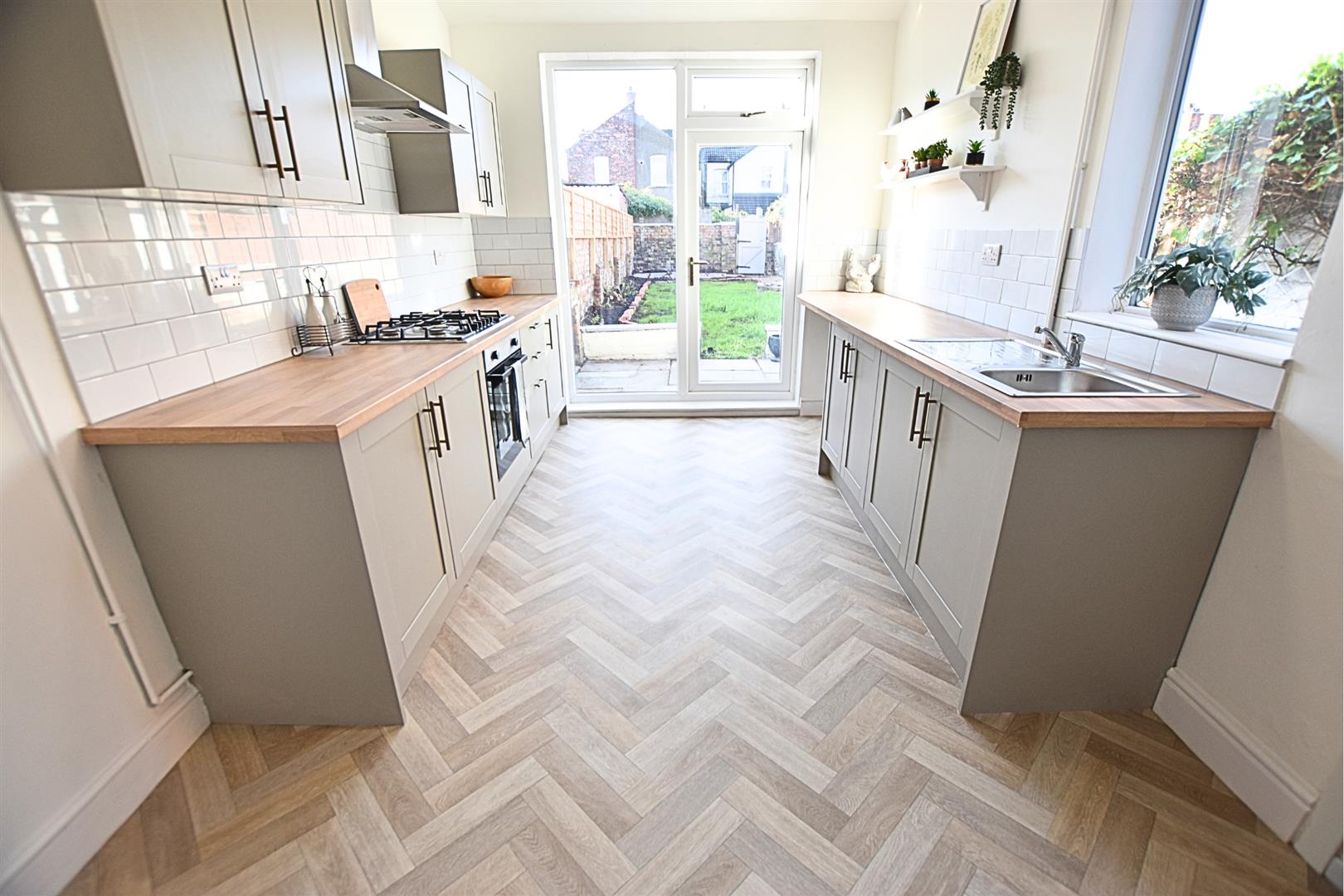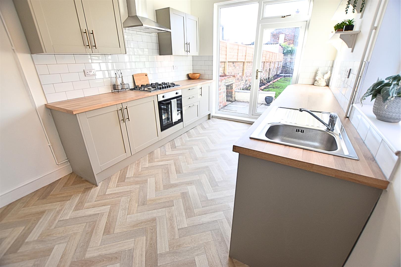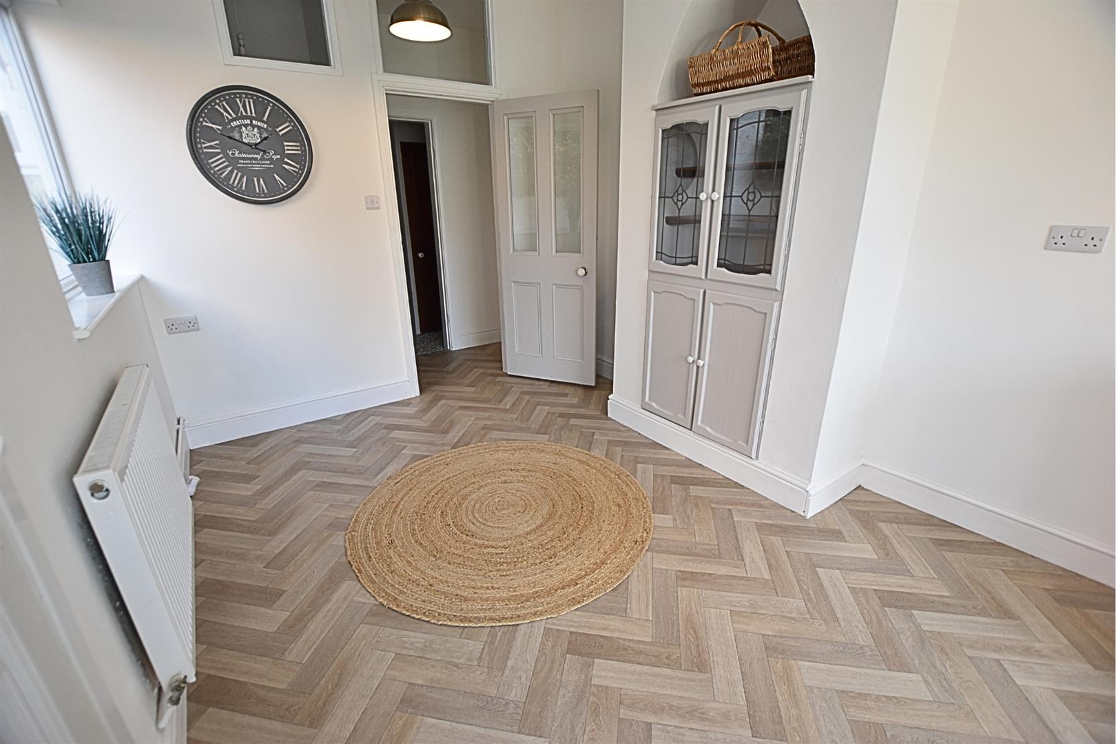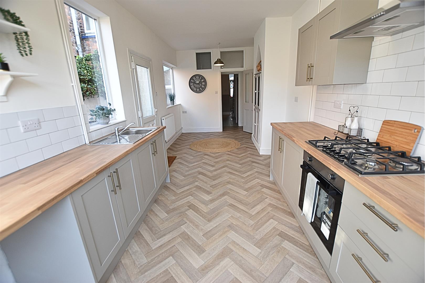 This stylish open-plan living kitchen diner is the heart of the home, offering a perfect blend of modern design and practical family living. The newly fitted contemporary kitchen features pebbled coloured sleek shaker-style units with matching pan draws, wood-effect worktops, tiled splashbacks and incorporates a stainless steel sink and drainer, gas hob, electric fan assisted oven and stainless steel chimney style extractor hood and ample space for a freestanding fridge freezer, under counter space for washing machine and tumble dryer. The herringbone style vinyl flooring flows seamlessly throughout, creating a sense of space and continuity, while uPVC glazed door and side light panel opens out onto the garden, filling the room with natural light. Two further uPVC double glazed window and side door lead to the side of the property. Having a feature chimney breast with alcove storage and radiator. The versatile layout easily accommodates both dining and relaxation areas, making it ideal for entertaining guests or enjoying everyday family life.