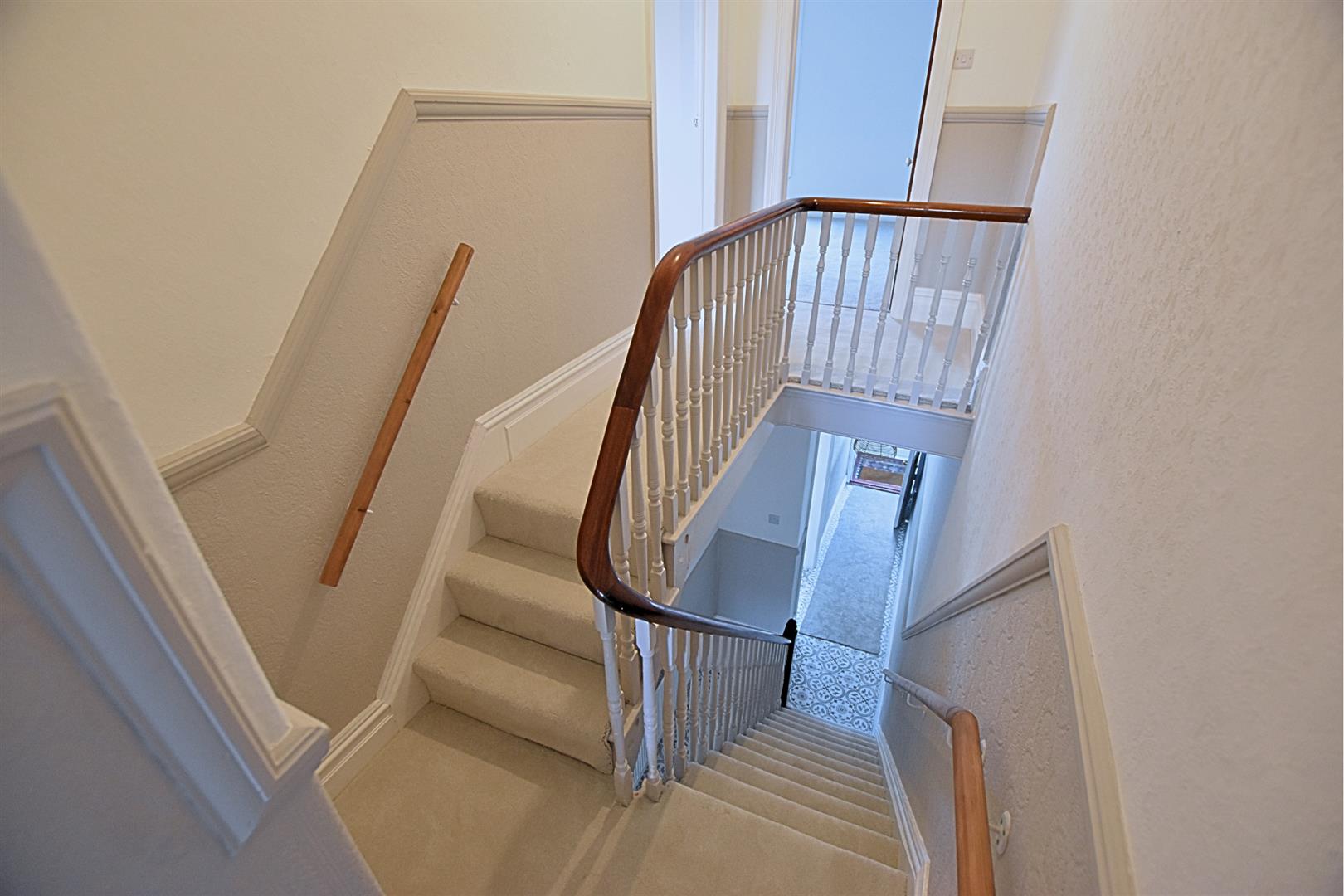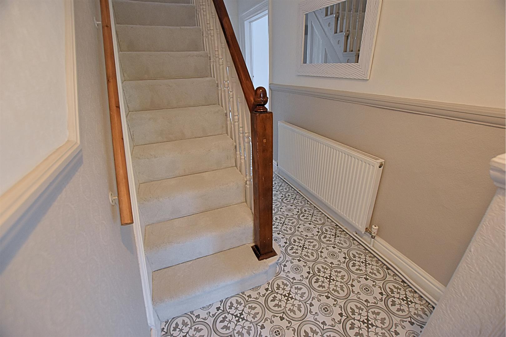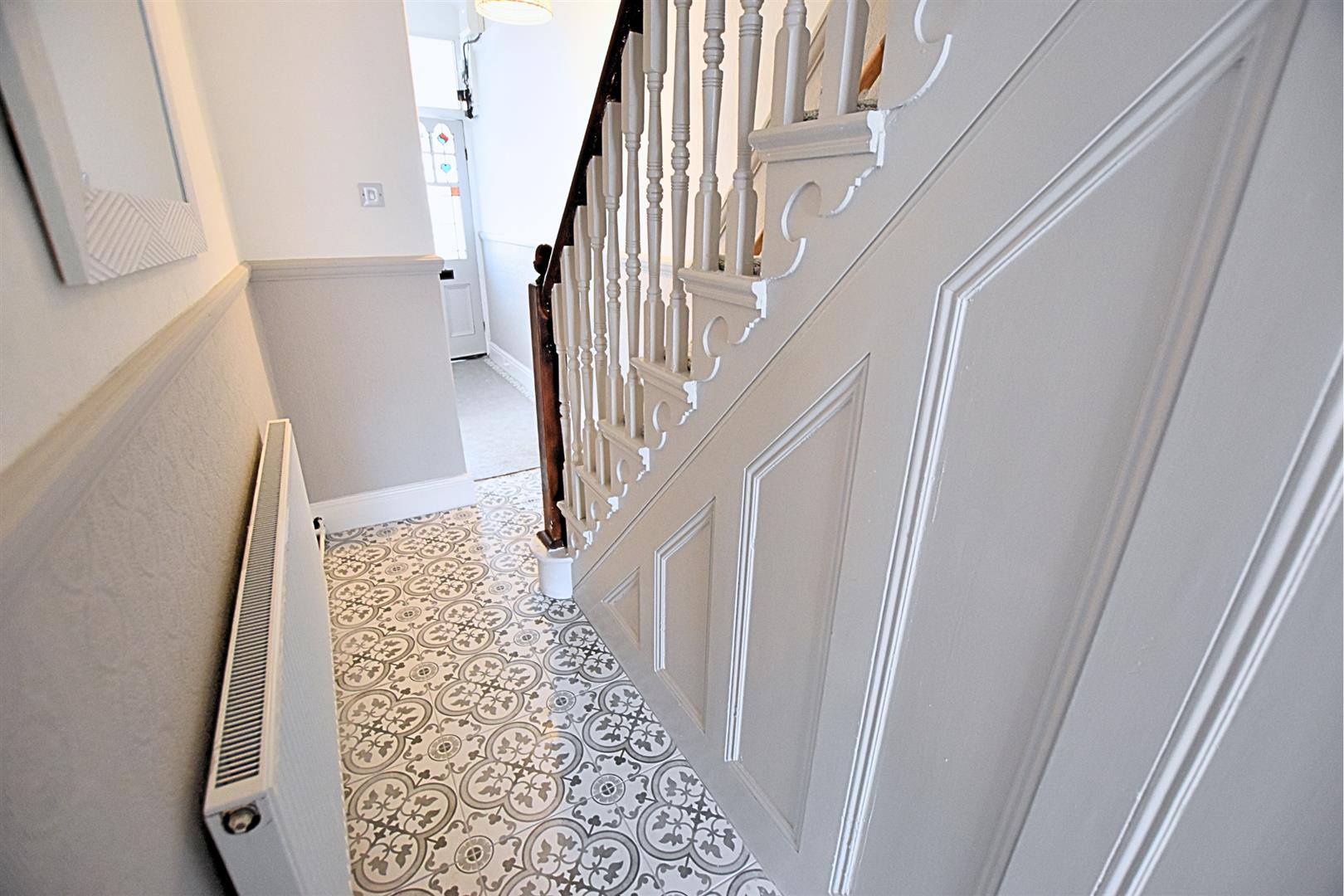 The hallway retains original coving and cornice to the ceiling along with picture and dado rail. Modern tiled flooring with newly carpeted stairs which retains the original Oak banister with white open spindle balustrade, handy under stairs storage cupboard, radiator and original wooden connecting doors.
