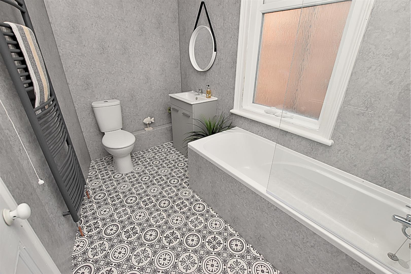 The newly fitted modern bathroom benefits from a white three piece suite comprising of; Bath with hand shower over and glazed screen, vanity hand wash unit with handy storage and low flush wc. Finished with modern Aqua panelled walls, tiled effect vinyl flooring, heated towel rail and uPVC double glazed window to the side aspect.