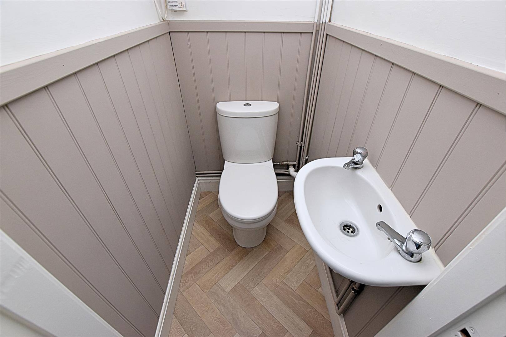 Benefitting from a white two piece suite which comprises of; Low flush wc and wall mounted hand wash basin. Having tongue and groove panelling to dado height, wood effect Herringbone style vinyl flooring, light window to the kitchen and wall mounted boiler.