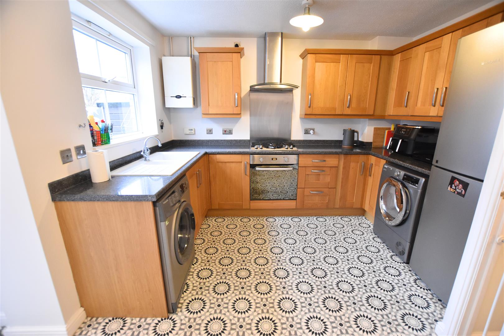 The kitchen diner is a good size and is open plan to the sunroom creating a fabulous entertaining area. Benefitting from a large range of Walnut coloured shake style wall and base units with contrasting worksurfaces and matching upstands incorporating a composite sink and drainer, gas hob with stainless steel splash back, chimney style extractor hood and electric fan assisted oven beneath, ample space for an automatic washing machine, tumble dryer and freestanding fridge freezer. Finished with modern vinyl flooring, radiator and uPVC double glazed window overlooking the garden.