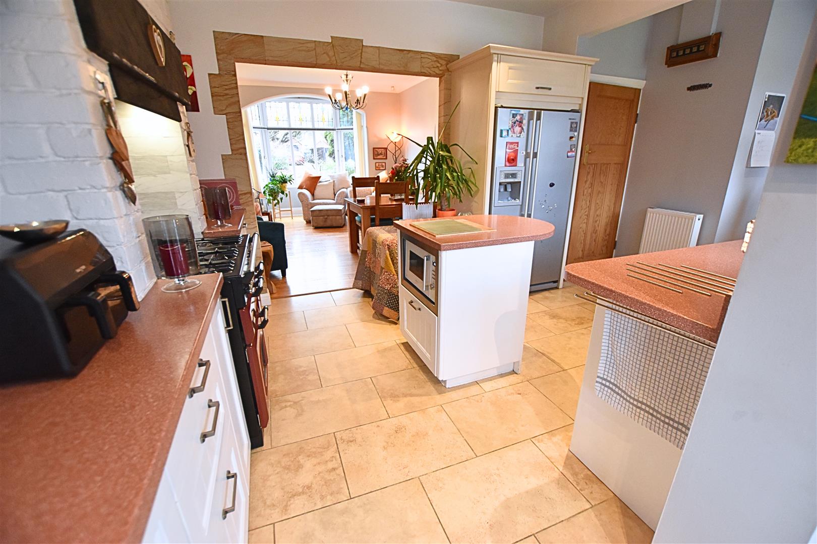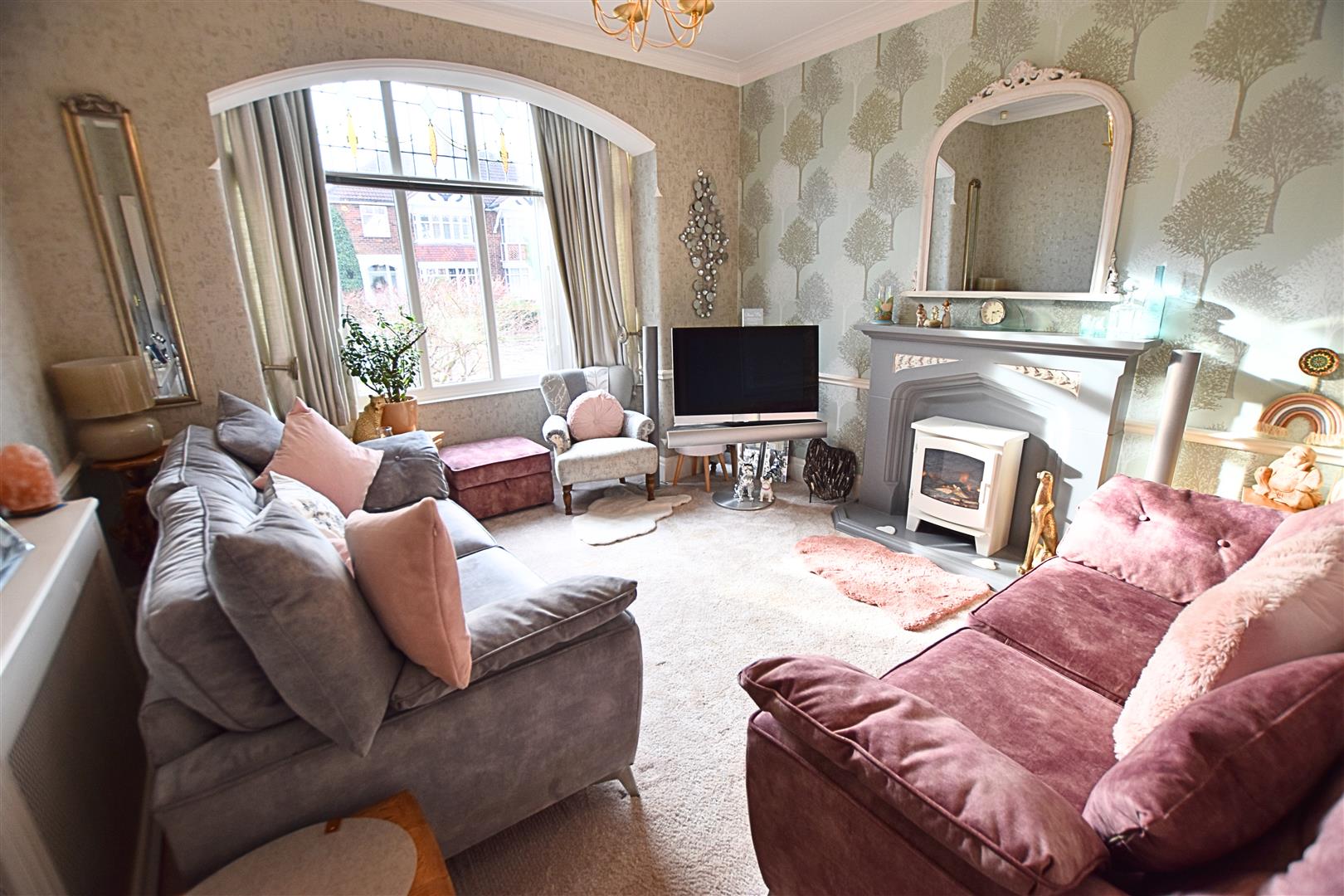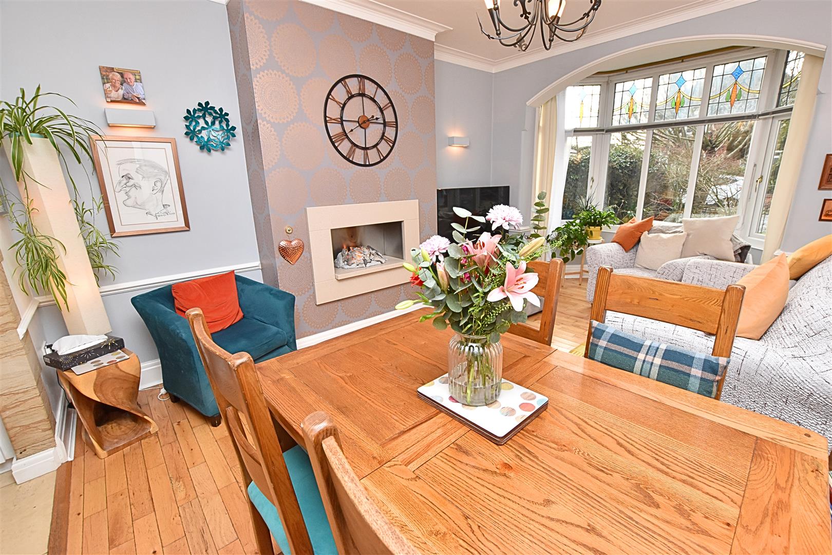 Open from the kitchen with a uPVC double glazed bay window with original encased stain glass, coving and ceiling rose, dado rail, wood flooring, radiator and feature modern flame fire inset into the chimney breast. This fantastic space has enough room for a lounge area and family dining table.