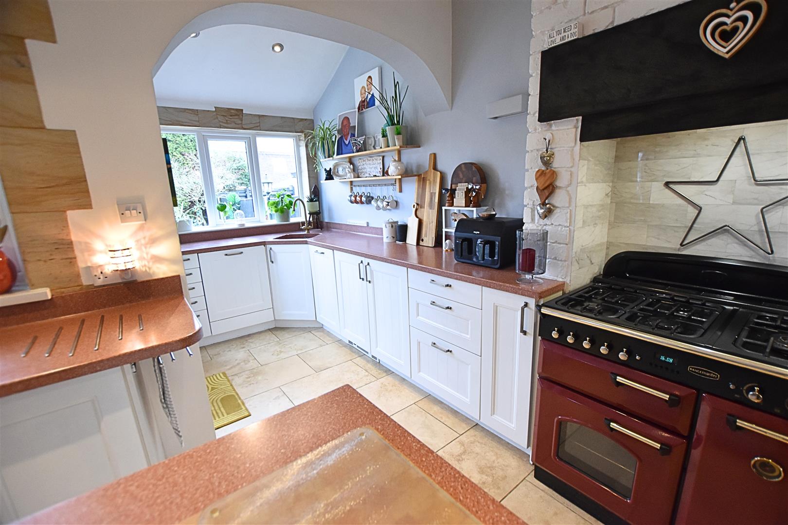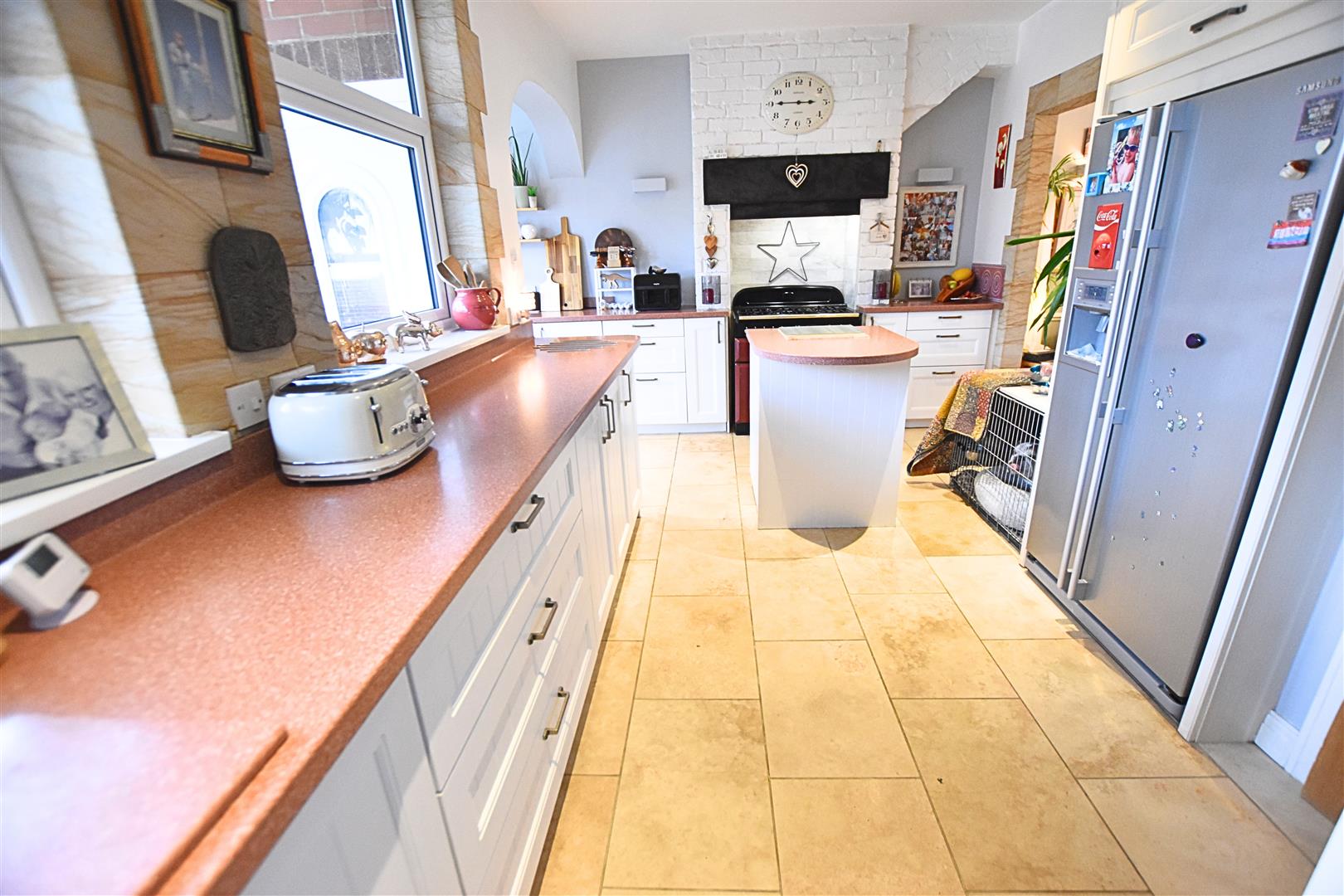 The L-Shaped kitchen is open plan to the dining day room creating an ideal family or entertaining area with the kitchen to one side which benefits from a range of white fronted low level units with contrasting Corian worksurfaces and matching upstands incorporating an inset Corian sink with stainless steel base, feature chimney breast with Rangemaster over and extractor hood above, integrated dishwasher and fully plumbed for water and ice American style fridge freezer, matching centre island with built in microwave. Finished with three uPVC double glazed windows overlooking the rear garden, and uPVC door with side light panel leading to the patio, down lights to the ceiling, tiled flooring and radiator.