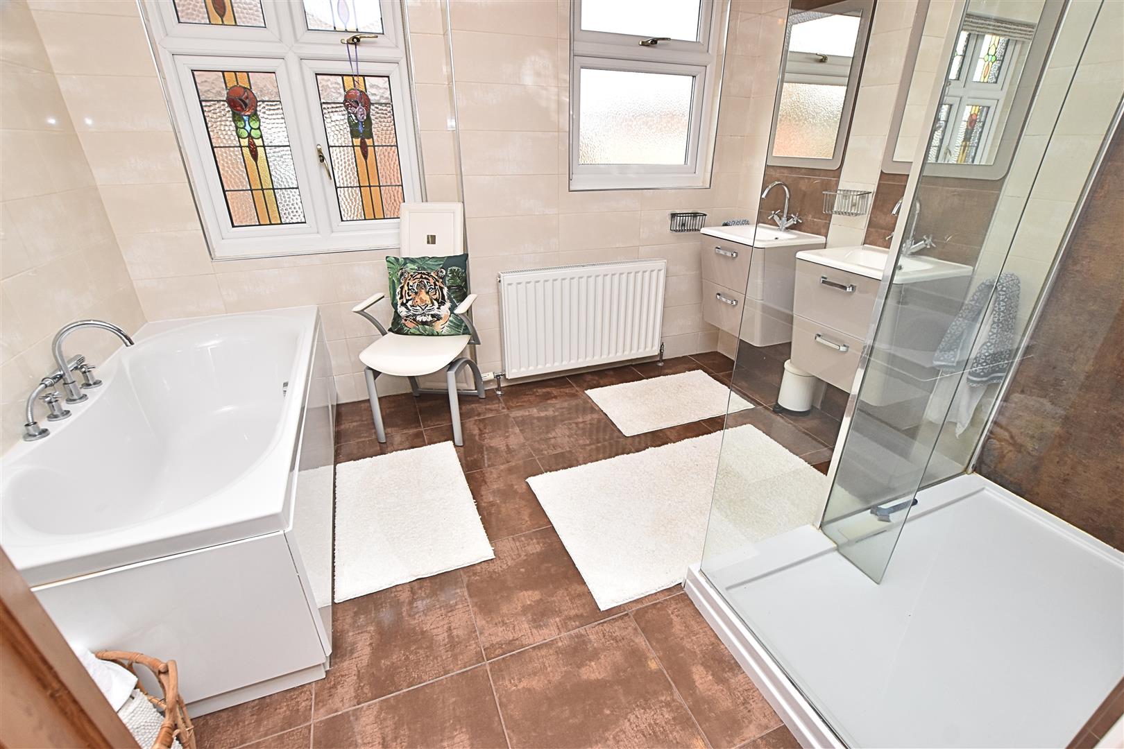 The modern family bathroom benefits from a white four piece suite comprising of; Walk in shower with glazed screens and Aqua style panelling to the splash back areas, bath with central taps and hand shower attachment and his and her floating vanity hand wash basins with handy storage draws. Finished with two uPVC double glazed windows with original encased stained glass, full tiling to the walls and floor, down lights to the ceiling and a radiator.