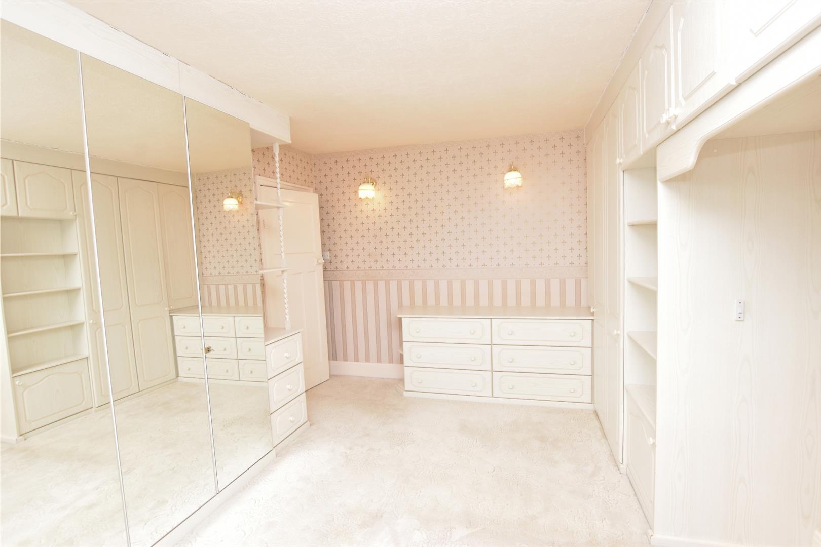Fitted with an excellent range of bedroom furniture including a bank of mirror fronted wardrobes, two drawer units and wardrobes either side of the bed space. Double glazed window. Radiator. Wall light points.