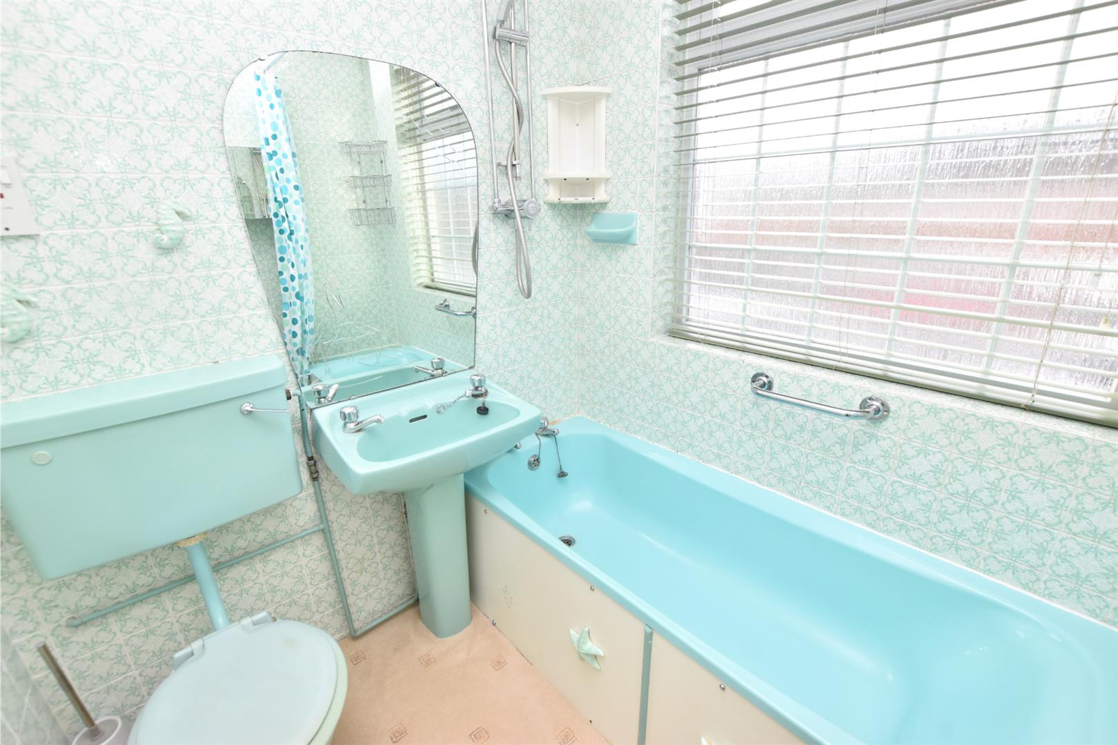 Having a coloured suite including a panelled bath with a shower above, a pedestal wash hand basin and a low flush wc. Wall mounted mirror above the wash hand basin. Fully tiled walls. Radiator. Double glazed.