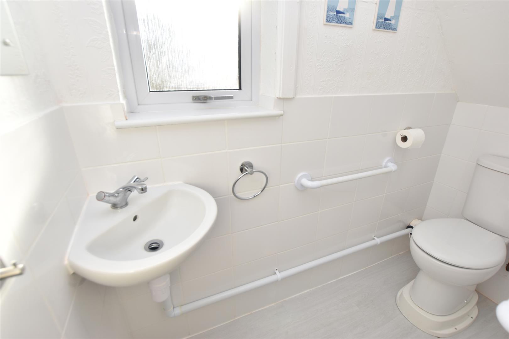 Fitted with a white corner sink and a wc. The walls are half tiled with a double glazed window and laminate flooring.
