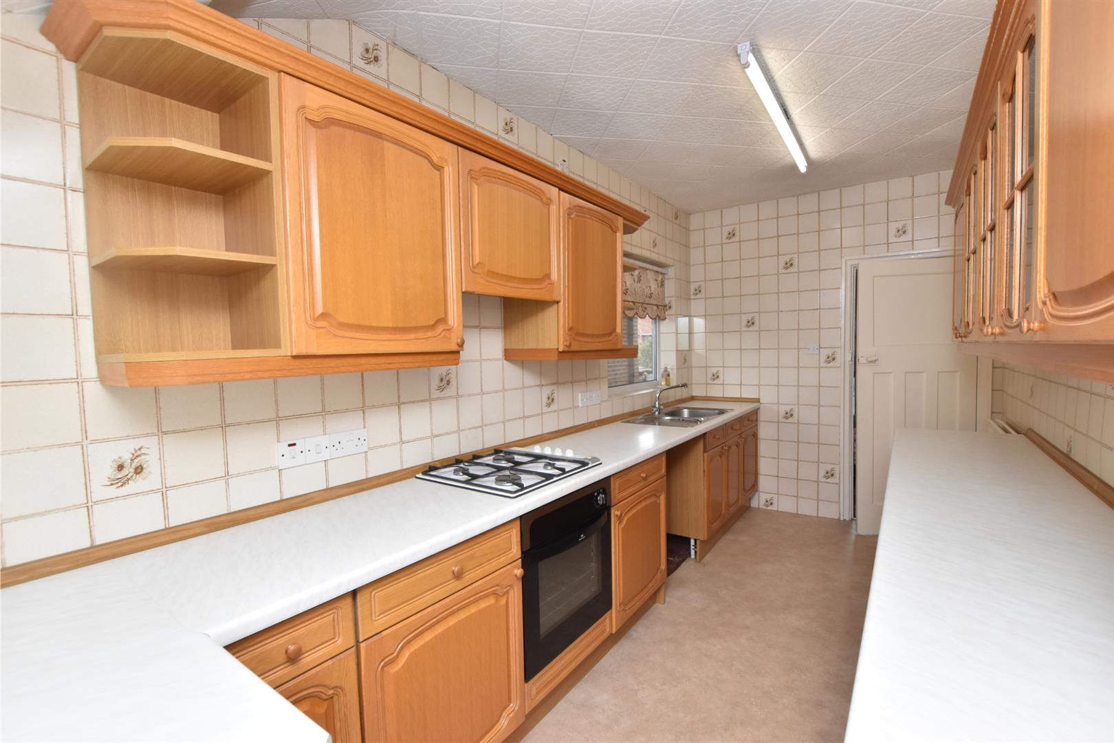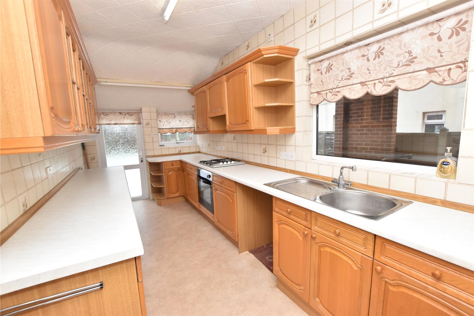 Fitted with an excellent range of medium oak style base and wall units incorporating an electric oven, gas hob with an extractor fan above. The contrasting work surfaces are inset with a stainless steel sink unit which has space beneath for a washing machine. Extensively tiled walls. Radiator. Two double glazed window and door.