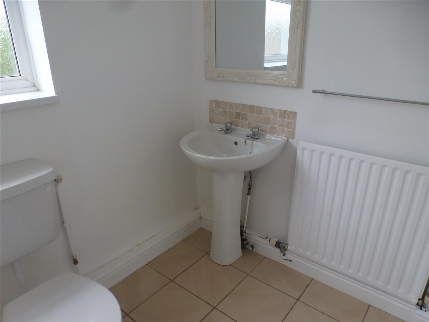 With suite in white comprising pedestal wash basin, low flush WC and paneled bath with Triton shower system over. Cream ceramic tiling to bath area and to the floor. Central heating radiator. Extractor fan. Double glazed window to rear.