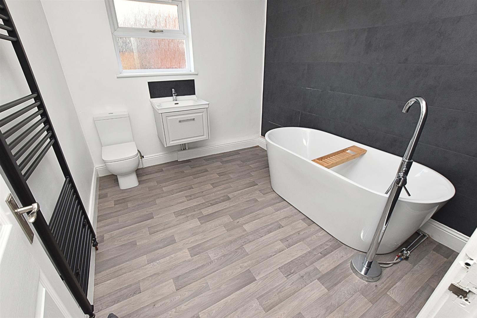 The family bathroom benefits from a white three piece suite comprising of; Free standing bath with floor standing tap and hand shower attachment, floating hand wash basin with storage draw and low flush wc. Finished with feature tiled effect Aqua panelling, wood effect vinyl flooring, heated towel rail, extractor fan and uPVC double glazed window to the side aspect.