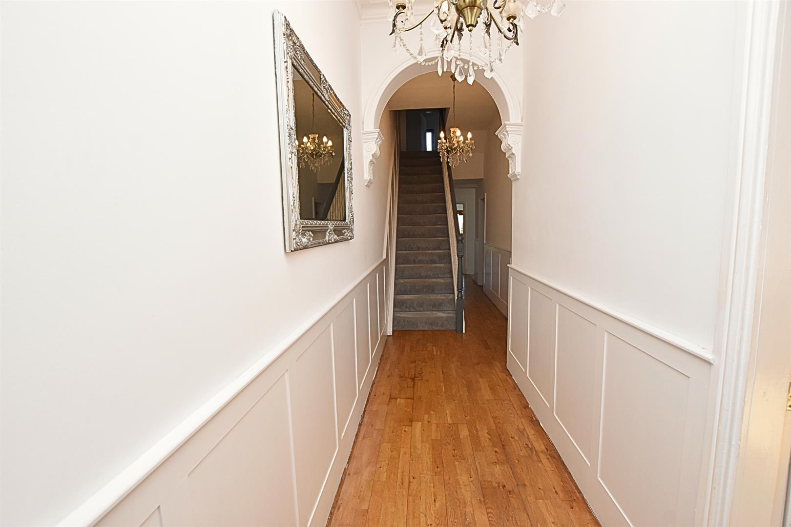 The welcoming reception hallway sets the feel for this fantastic family home, retaining original coving and cornice to the ceiling, high skirting, solid wood flooring, feature wall panelling to dado height, and carpeted stairs with ornate open spindle balustrade leading to the first floor. Handy under stairs storage cupboard. Further tiled hallway with uPVC double glazed door leading to the side of the property.