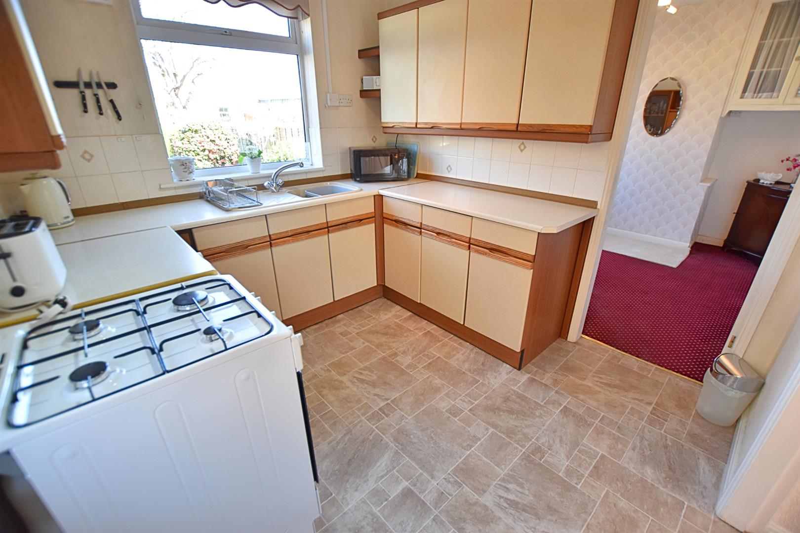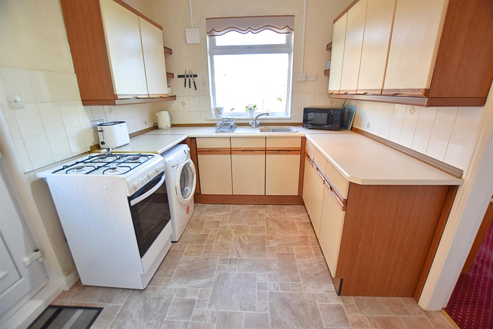 The kitchen benefits from a range of cream fronted wall and base units with contrasting work surfaces and tiled splashbacks incorporating a composite sink and drainer with gas oven and hob, automatic washing machine and handy pantry area. Finished with vinyl flooring and a uPVC double glazed window overlooking the rear garden and a uPVC double glazed door to the side aspect.