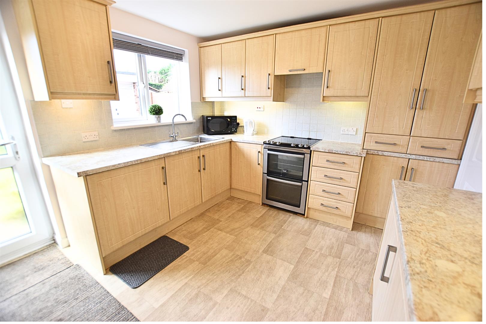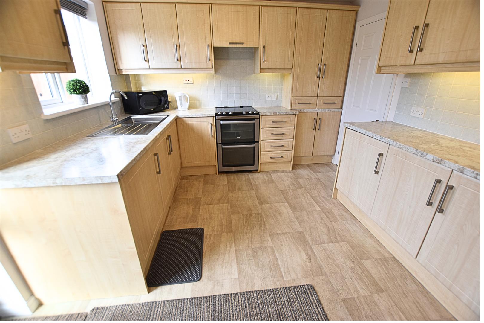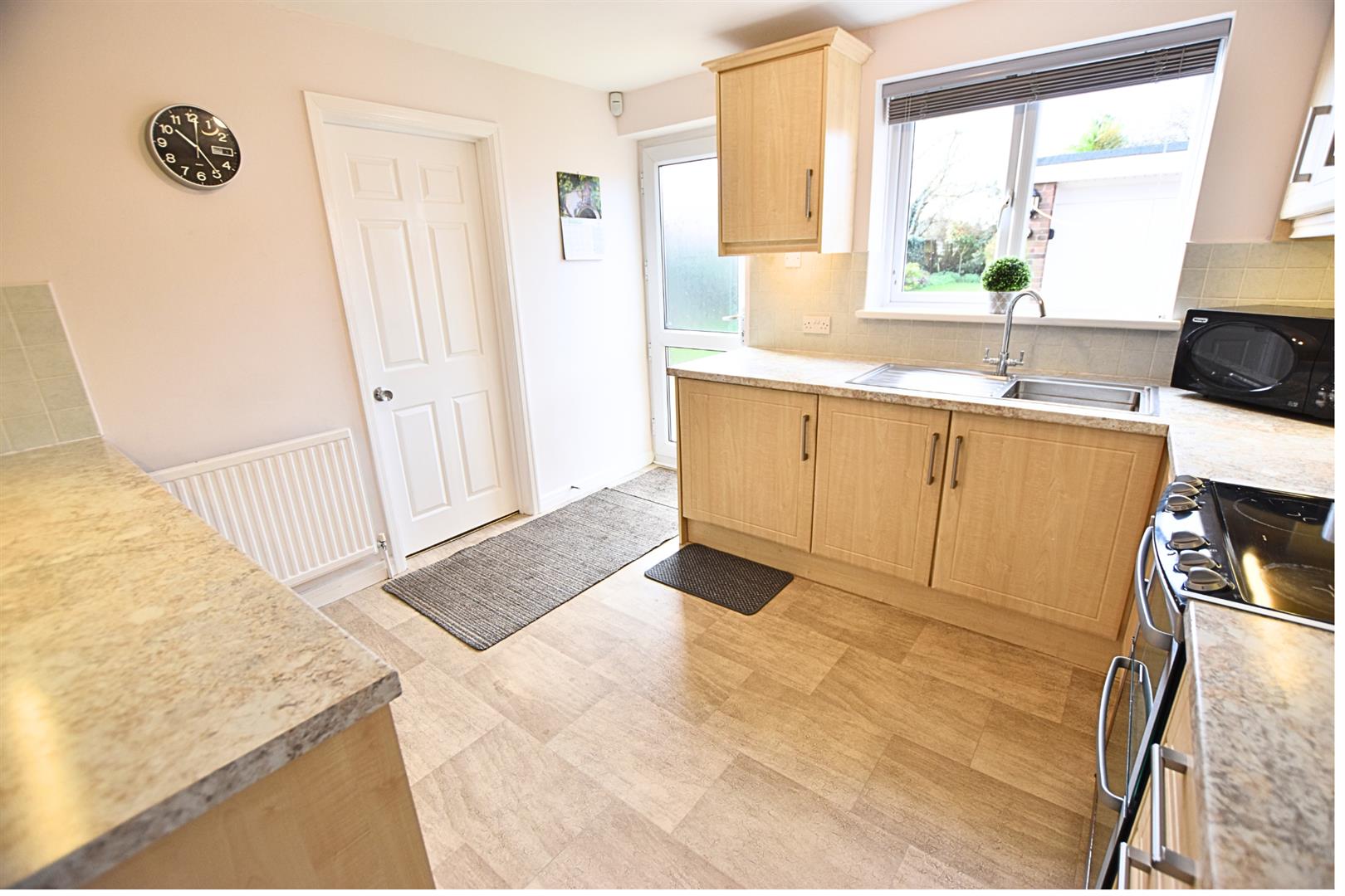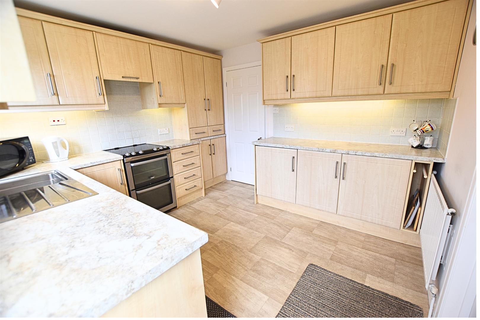 The kitchen benefits from a large range of beech fronted wall and base units with contrasting work surfaces and tiled splashbacks and incorporates a stainless steel sink and drainer, slot in electric oven and hob with extractor hood above, integrated fridge and automatic washing machine. Finished with tiled effect vinyl flooring, radiator, uPVC double glazed window with blinds fitted and a uPVC double glazed door overlooking the rear garden.