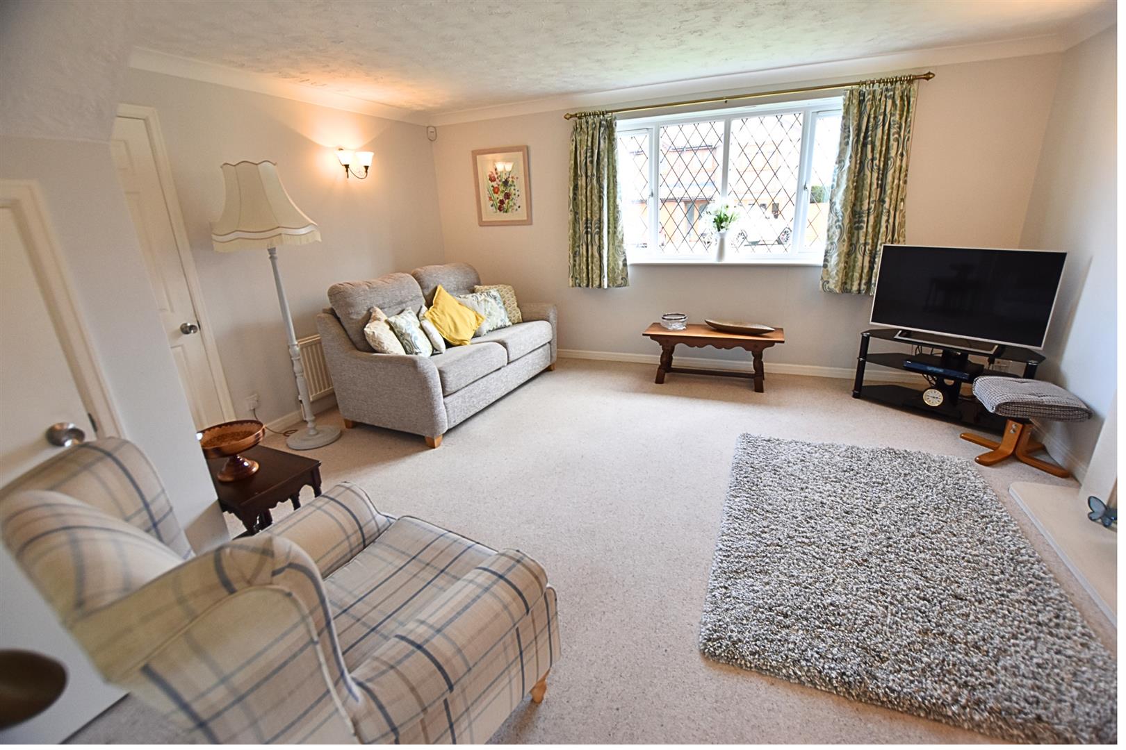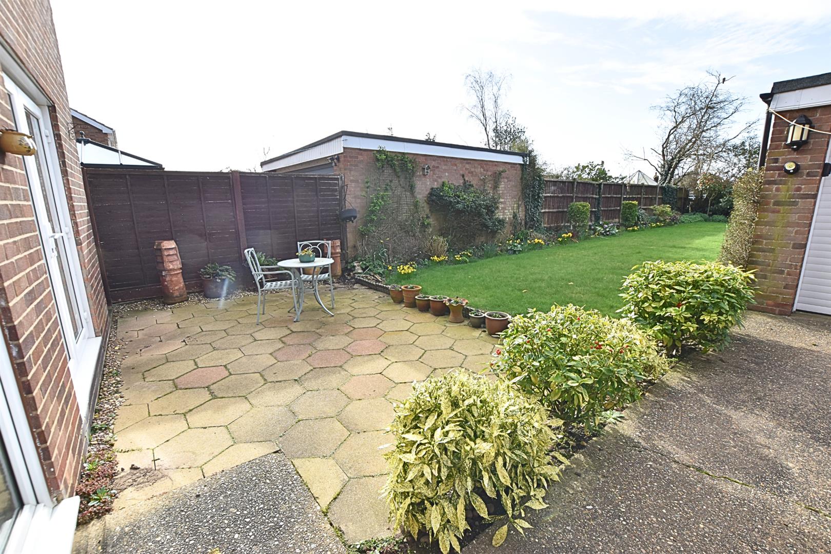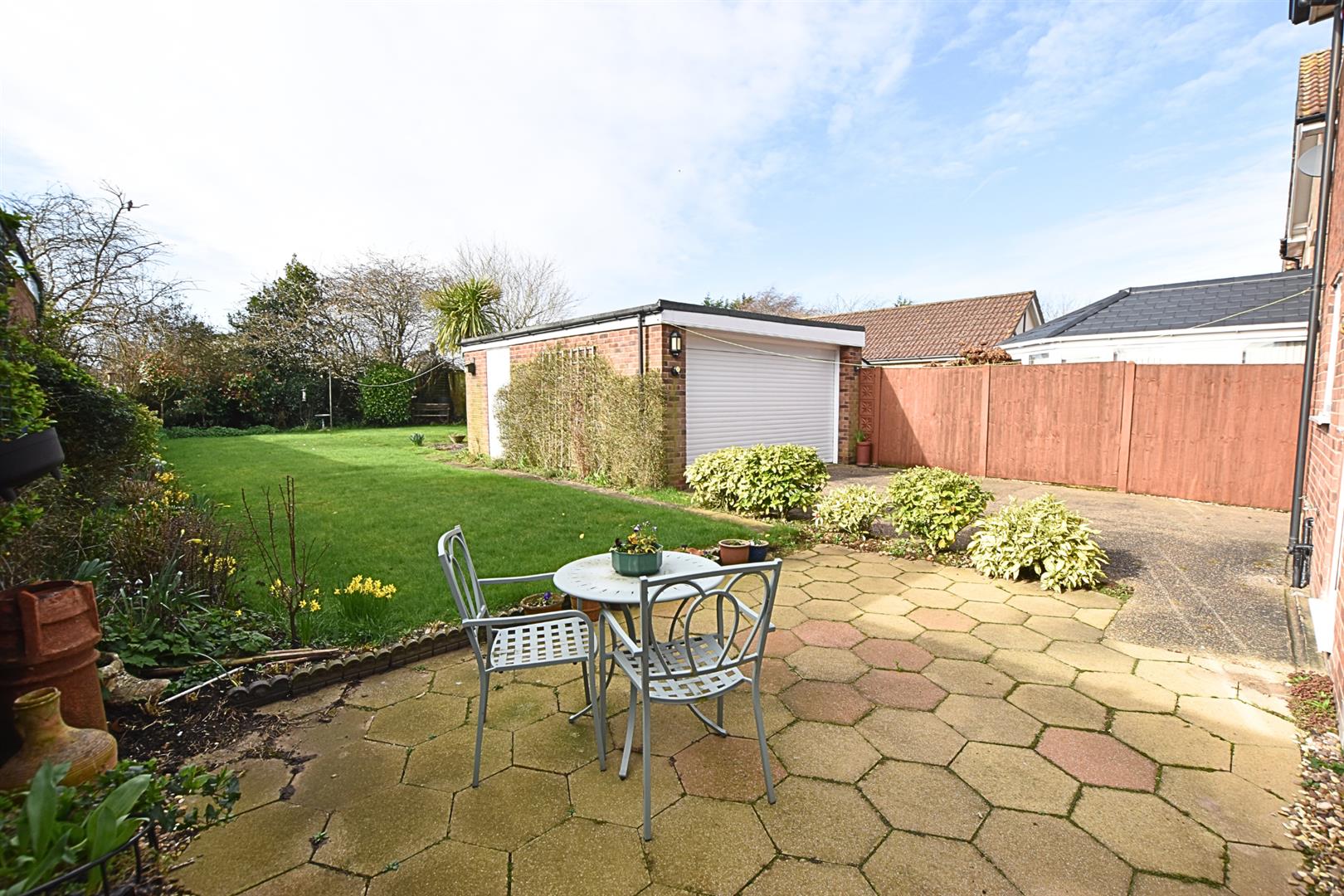 The property enjoys a large plot with an open plan garden to the front which is mainly laid to lawn with a paved driveway providing ample off road parking and leading to the detached double garage. The southerly facing rear garden is a great size with fenced boundaries and mature planting to the borders and benefits from dual aspect paved patios ideal for lazy summer afternoons and outside entertaining.