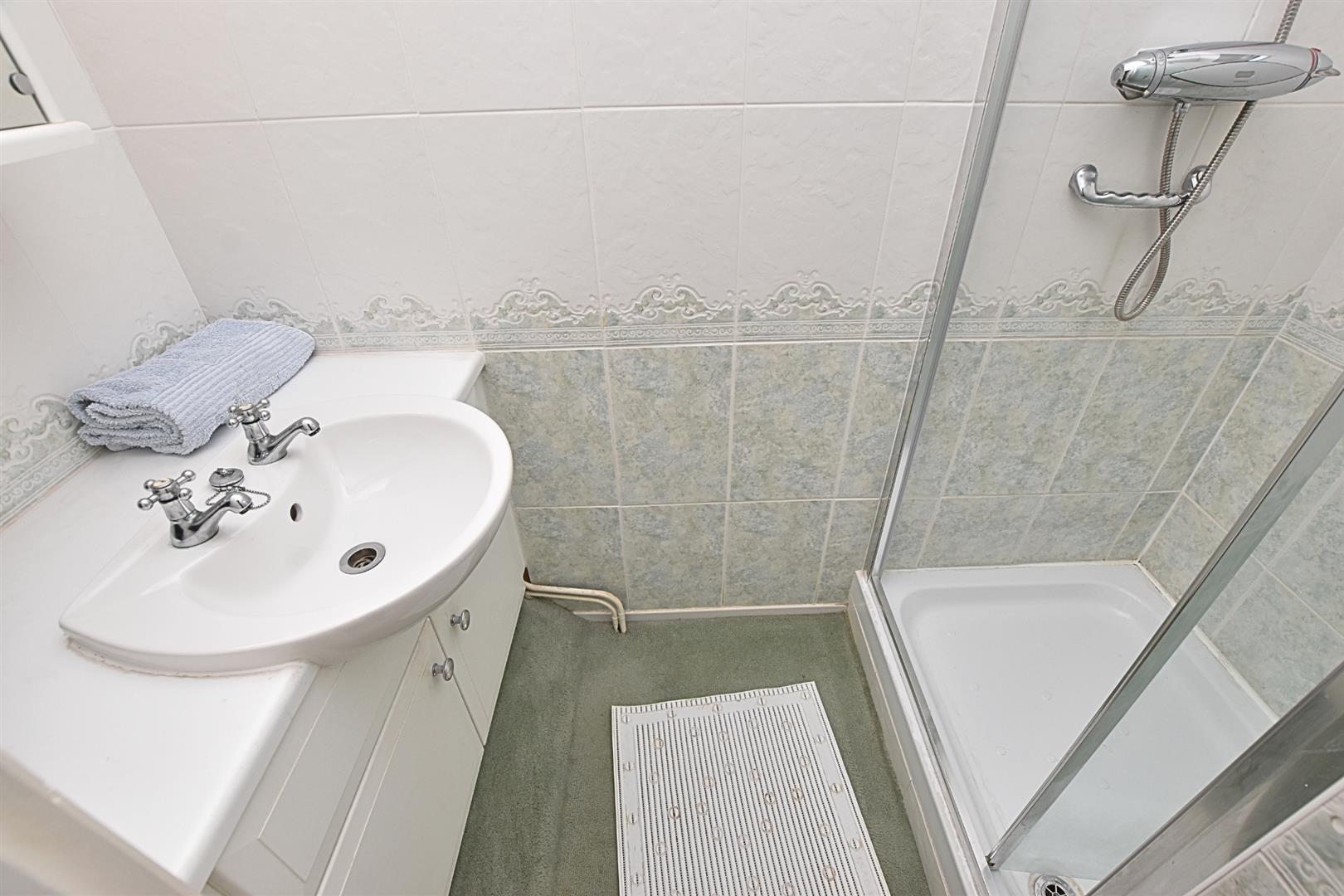 The en suite shower room benefits from a white two piece suite comprising of shower with glazed screen and vanity hand wash basin with handy storage having full tiling to the walls, carpeted flooring and uPVC double glazed window to the side aspect.