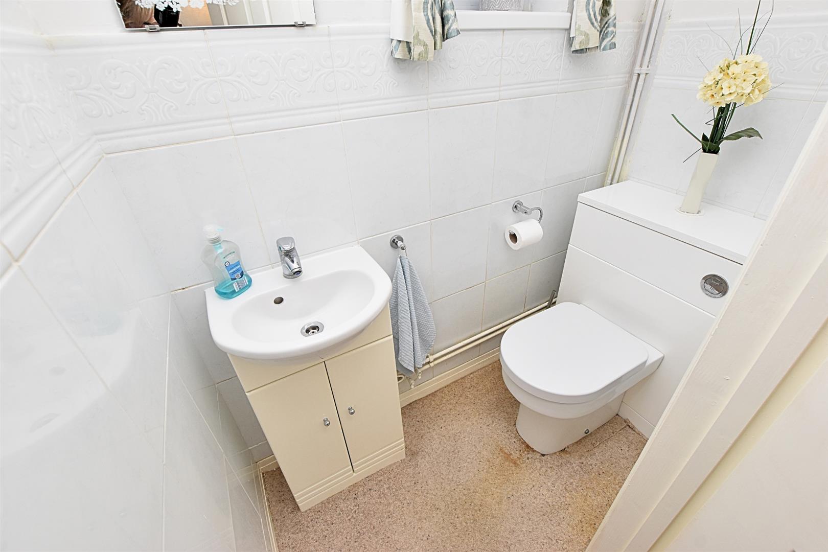 The handy cloakroom benefits from a white two piece suite comprising of; Vanity hand wash basin with useful storage and low flush wc with hidden cistern, part tiled walls, carpeted flooring and a uPVC double glazed window to the side aspect.