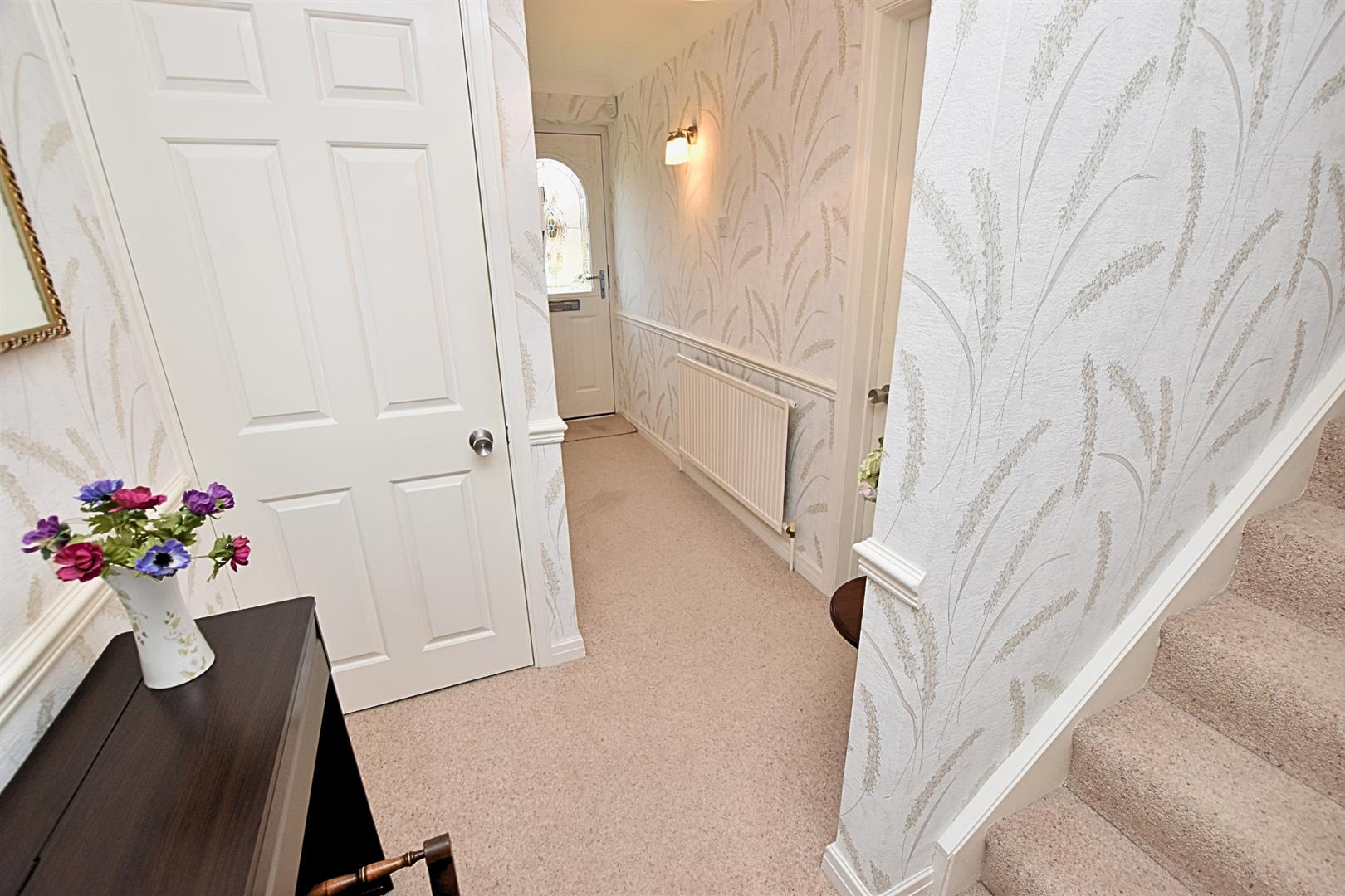 The welcoming hallway has coving to the ceiling, dado rail, carpeted flooring with carpeted stairs leading to the first floor, radiator, uPVC double glazed window to the side aspect and handy cloaks cupboard.