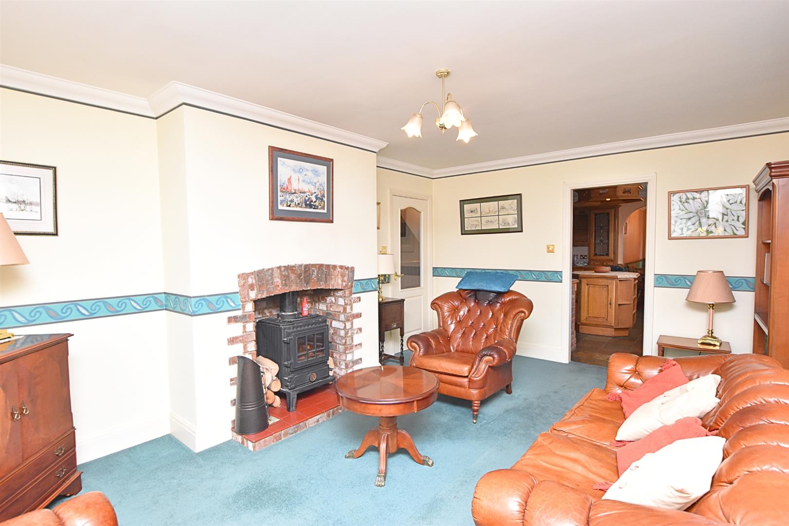 This cozy second sitting room has access to both the conservatory and kitchen and has a double glazed window, radiator and coving to ceiling. The focal point of this room is the black cast iron wood burner which is set within an exposed brick chimney recess.