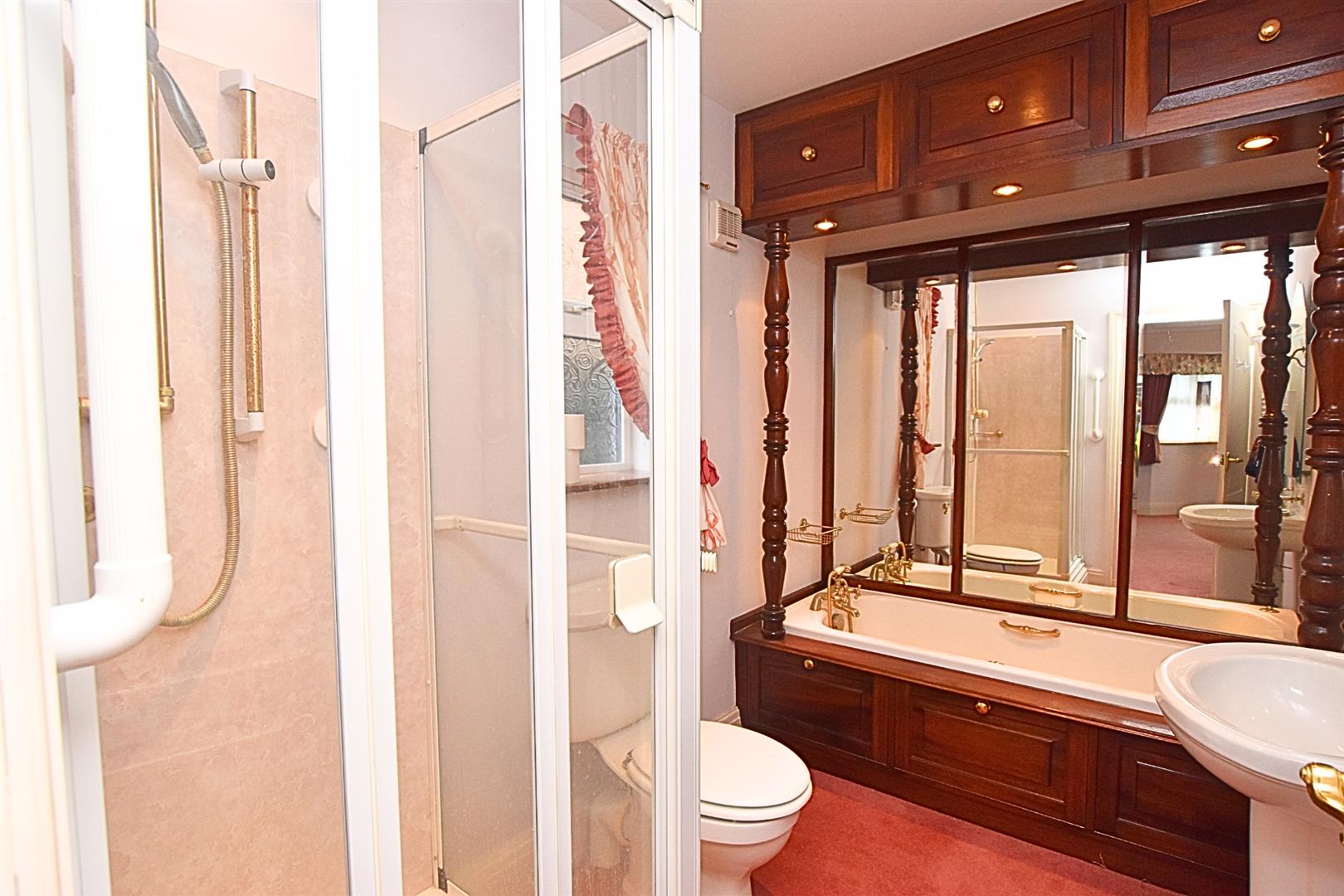 Fitted with an encased Jacuzzi bath which is set within a polished dark wooden frame including cupboards above and below the bath and includes a mirrored back, a pedestal wash hand basin, low flush wc and a shower cubicle. Double glazed window. Extractor ran. Heated towel rail. Above the wash hand basin is a wall mounted mirror.