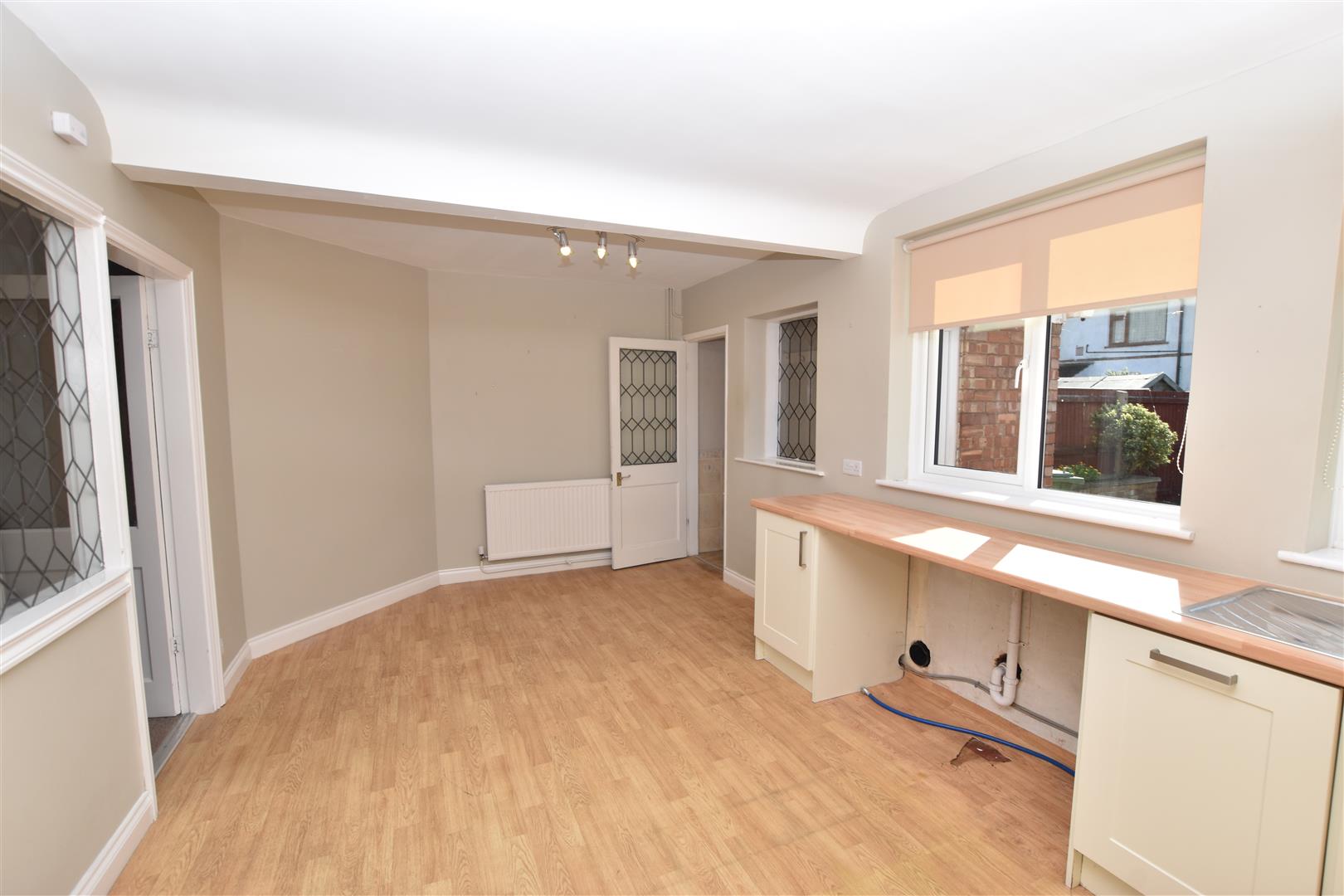 The kitchen benefits from a large range of cream shaker style wall and base units with contrasting wood effect work surfaces incorporating a stainless steel sink and drainer, electric hob with chimney style extractor hood above and electric fan assisted oven beneath, integrated dishwasher and ample space for a washing machine, tumble dryer and freestanding fridge freezer. Newly installed wall mounted boiler with nine years warranty remaining. Finished with wood effect vinyl flooring, radiator, two uPVC double glazed windows with blinds fitted to the rear aspect and a glazed door and window leading to the inner hallway.
