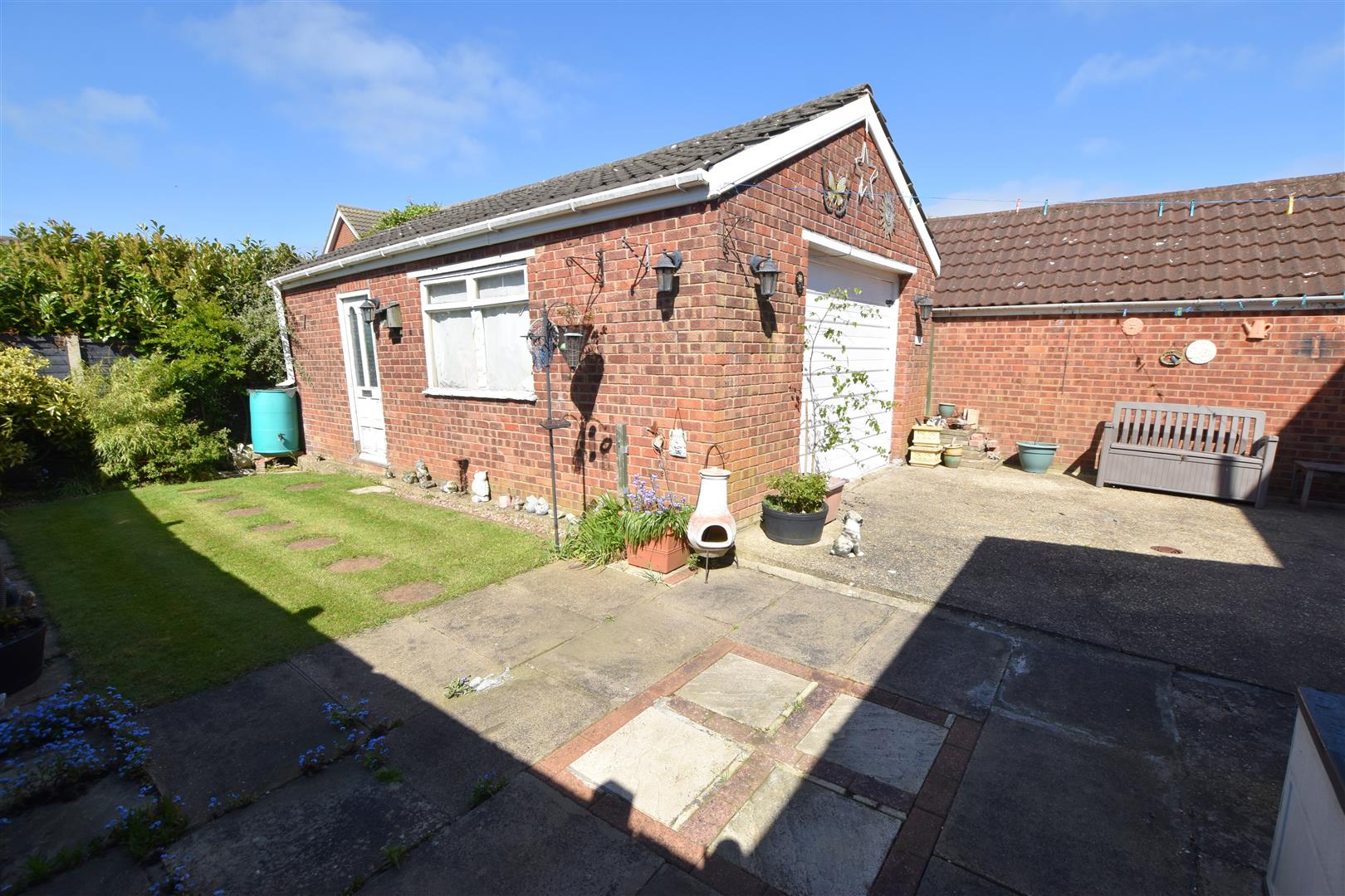 The property stands with well maintained gardens having and open driveway to the front providing ample off road parking, modern sleepers form a front boundary with fenced side boundaries, lawn with mature planting to the borders and a small nature pond. Double wooden gates lead to the rear garden and detached brick garage. The rear garden has fenced boundaries, lawn and mature planting to the borders. A paved patio provides a relaxing entertaining area.